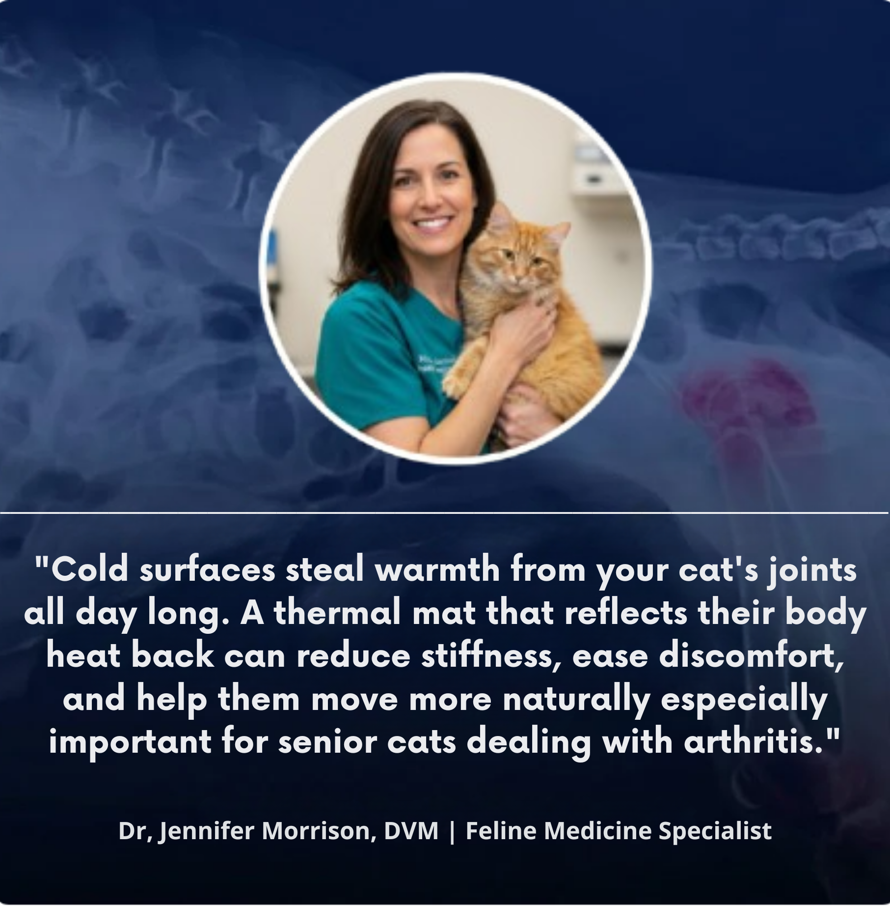Felinewell's aluminum foil layer traps and reflects your cat's natural body heat back to their joints — exactly where it's needed.